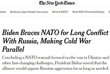 "Завершая саммит НАТО, посвященный войне в Украине и другим быстро меняющимся вызовам, президент Байден поклялся, что альянс будет противостоять российской агрессии столько, сколько потребуется", - гласит подзаголовок передовицы NYT.