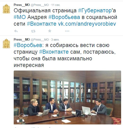 «Официальная страница #Губернатор'а #МО Андрея #Воробьева в социальной сети #Вконтакте http://vk.com/andreyvorobiev », - также сообщается в Twitter-аккаунте Воробьева.