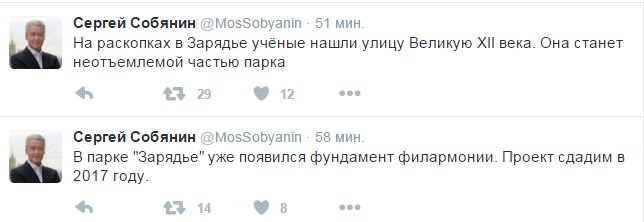 «На раскопках в Зарядье учёные нашли улицу Великую XII века. Она станет неотъемлемой частью парка», - сообщил Собянин в своем твиттер-аккаунте. В ходе археологических раскопок 2015 г. были обнаружены три яруса деревянной мостовой улицы Великой и срубы домов.