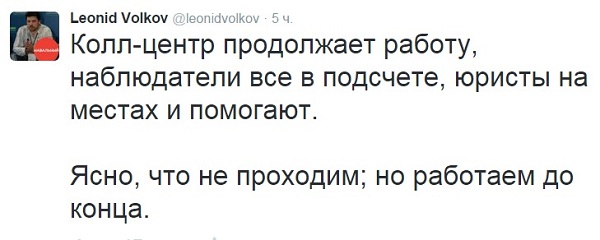 «Колл-центр продолжает работу, наблюдатели все в подсчете, юристы на местах и помогают. Ясно, что не проходим; но работаем до конца», - сообщил Волков.